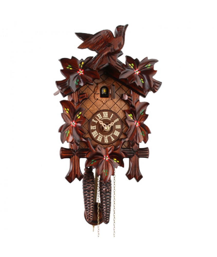 Mechanical cuckoo clock in the classic 5-Leaves-style with a carved cuckoo-bird on top. There are little red flowers painted onto the clock, which make it special. The cuckoo calls at the full and half hour and can be turned off with a little switch.