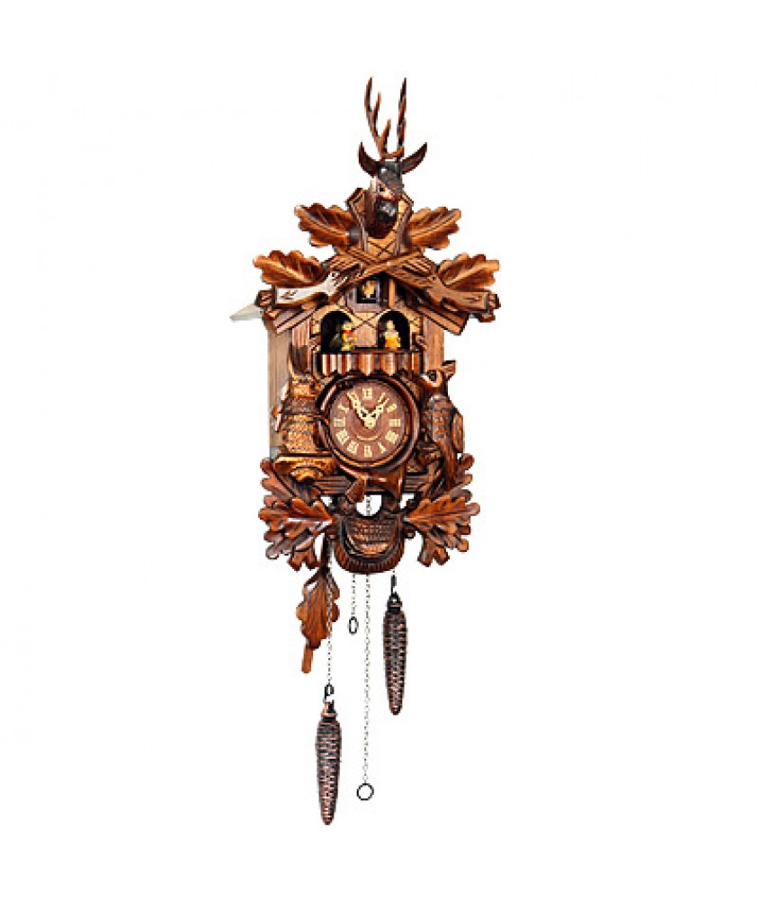 Cuckoo clock with quartz movement, 12 music melodies and dancers. You can see nice detailed hand-carvings, like the rabbit and the bird next to the clock face as also the deer-head at the top of the clock. At the full hour the cuckoo calls and tells the time and after that you hear one out of 12 melodies, which changes every hour, and the dancers move. Due to a light sensor the sounds get turned off automatically when it is dark but there is also a little switch which you can use to turn off the sounds manually.