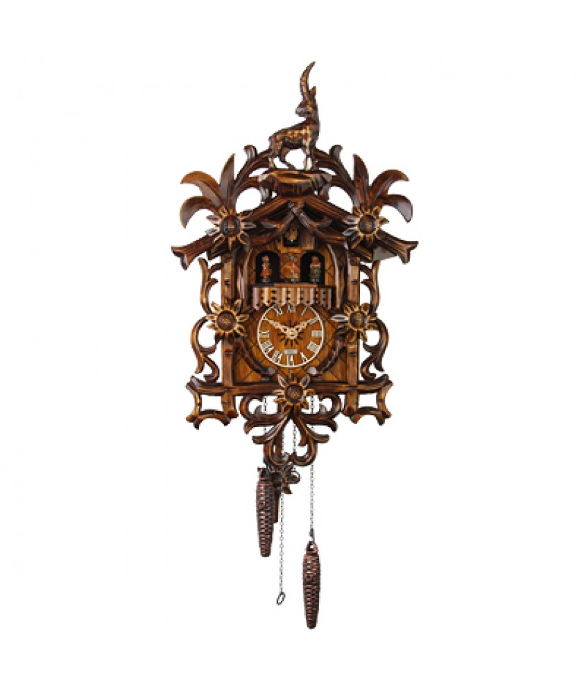 Quartz cuckoo clock in a special design. The edelweiss-flowers and the mountain goat as, too, the lovely details are hand-carved. The clock-hands, dancers and the clock-face are wooden, as well. At the full hour the cuckoo calls and then you hear one out of 12 melodies, which changes hourly, to which the dancers move. Due to a light-sensor the cuckoo-sound and music are turned off automatically when it is dark, but there is also a little switch, which you can turn the sounds off manually with.